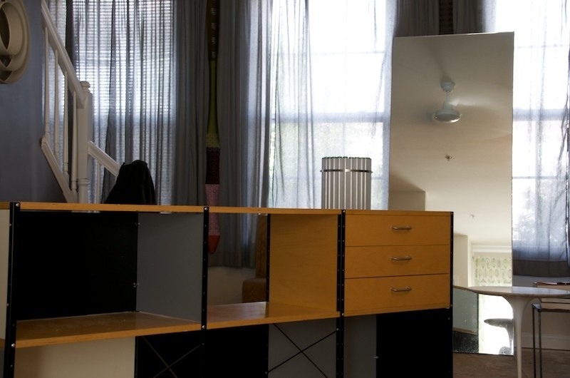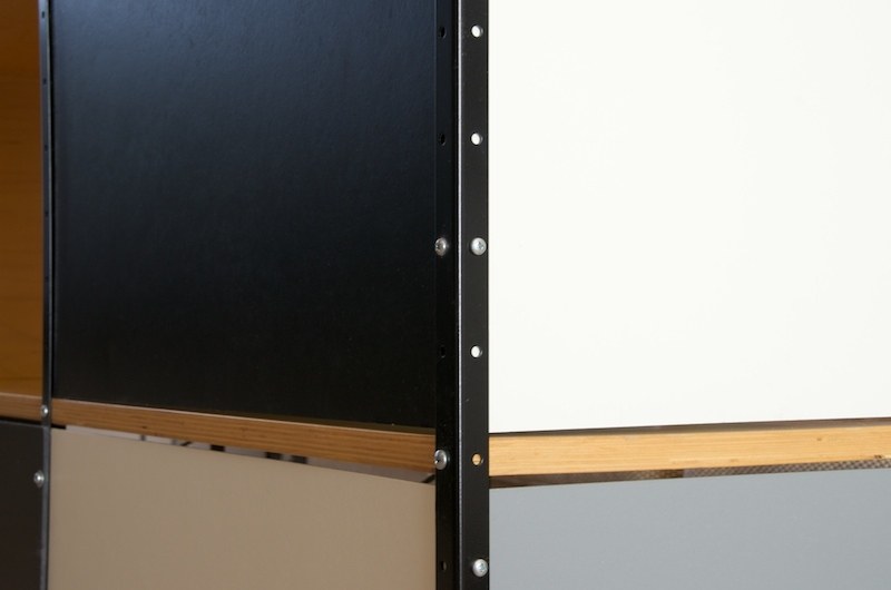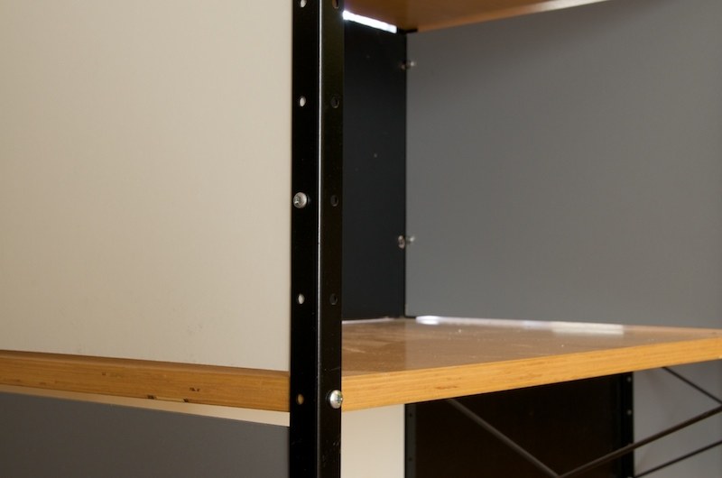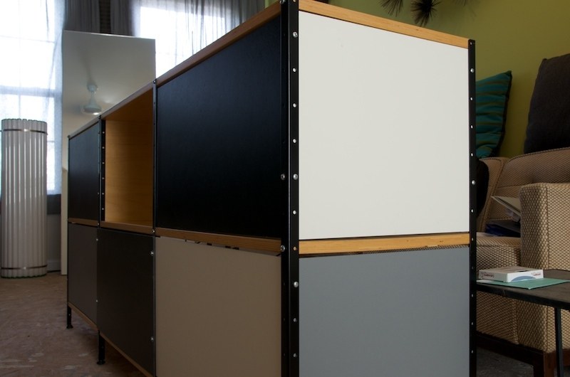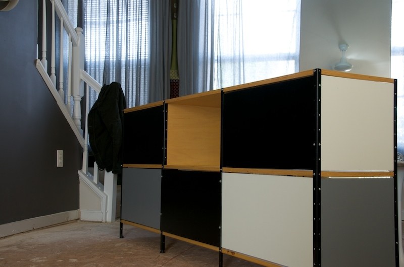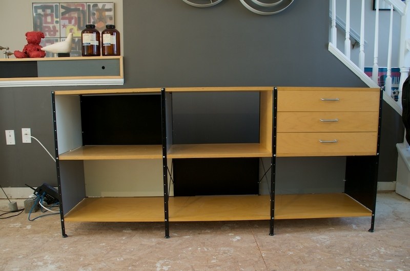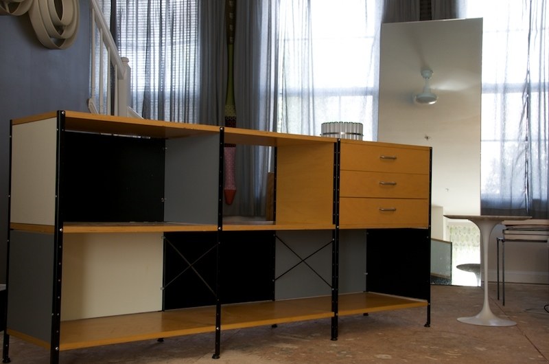 Classic Mid Century Modern Eames ESU storage unit. This was produced by Modernica about 10 years ago and has been long discontinued. Includes the three drawer unit. All panels are very minimalist in color -- white, black, grey, and birch. Can be used for books, display and media. Very solid and sturdy. Well taken care of and in very good condition.