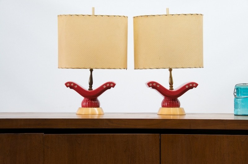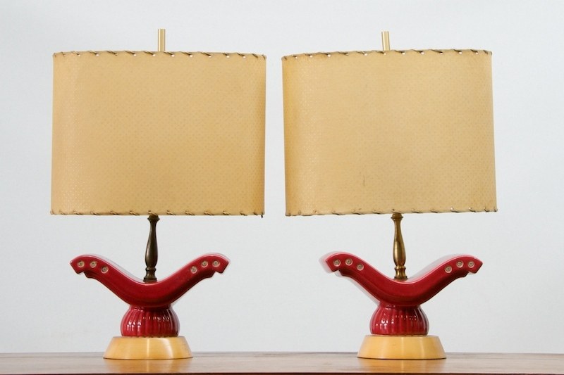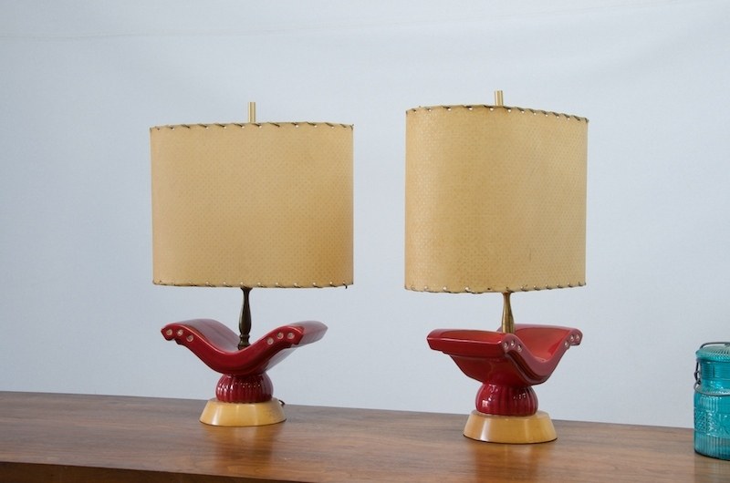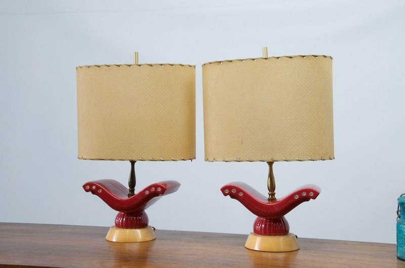French Red Glaze Ceramic Lamps. Birch bases. One is cracked but very presentable. Other is very good. Nice dotted fiberglass shades.