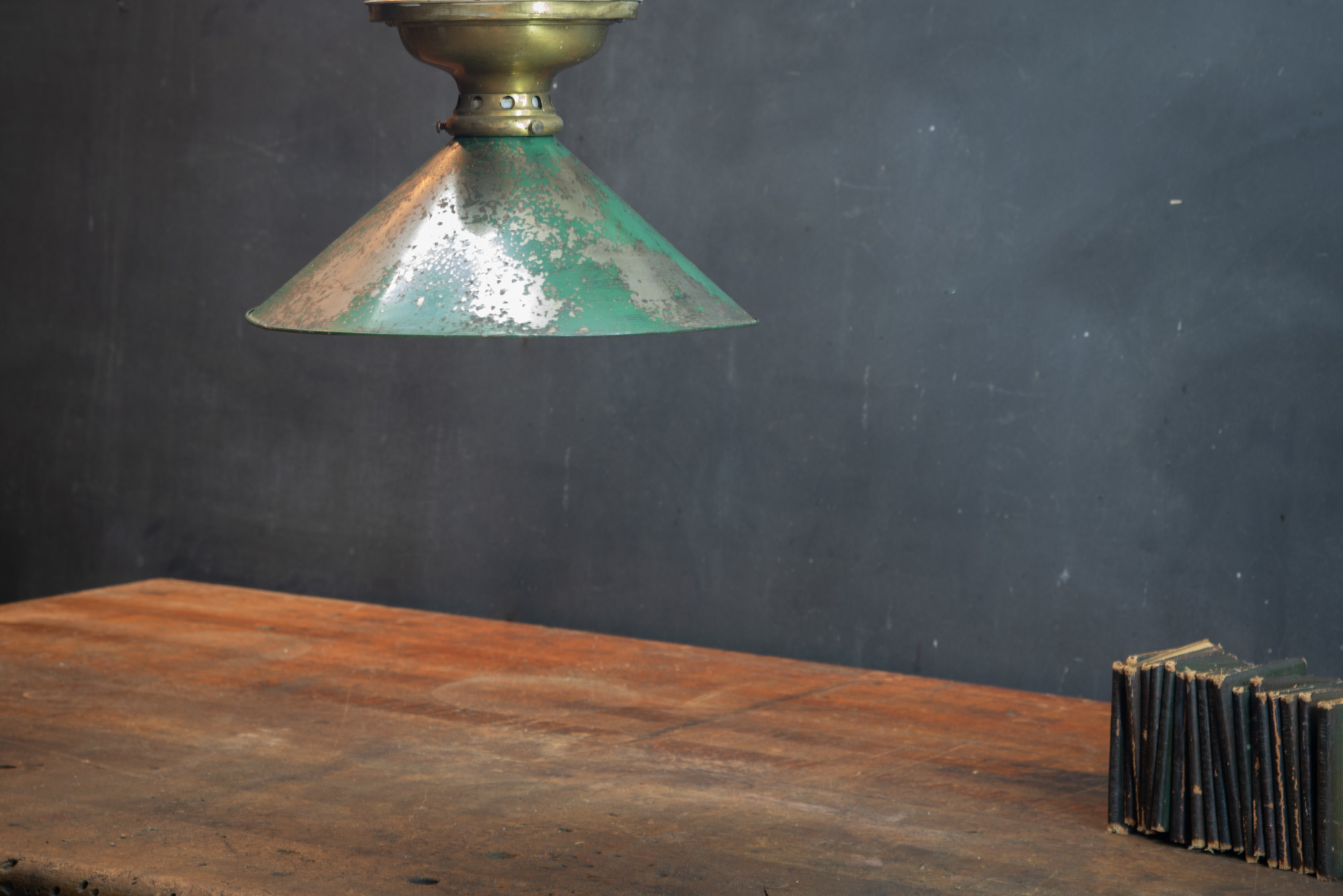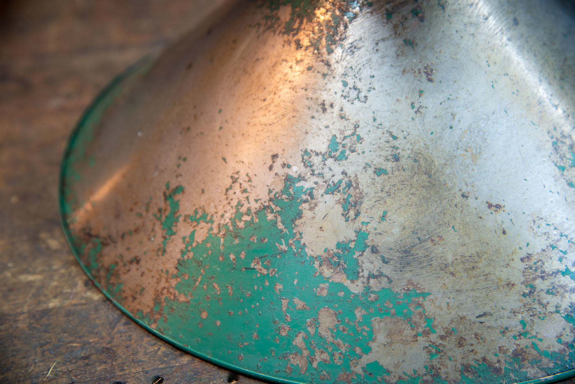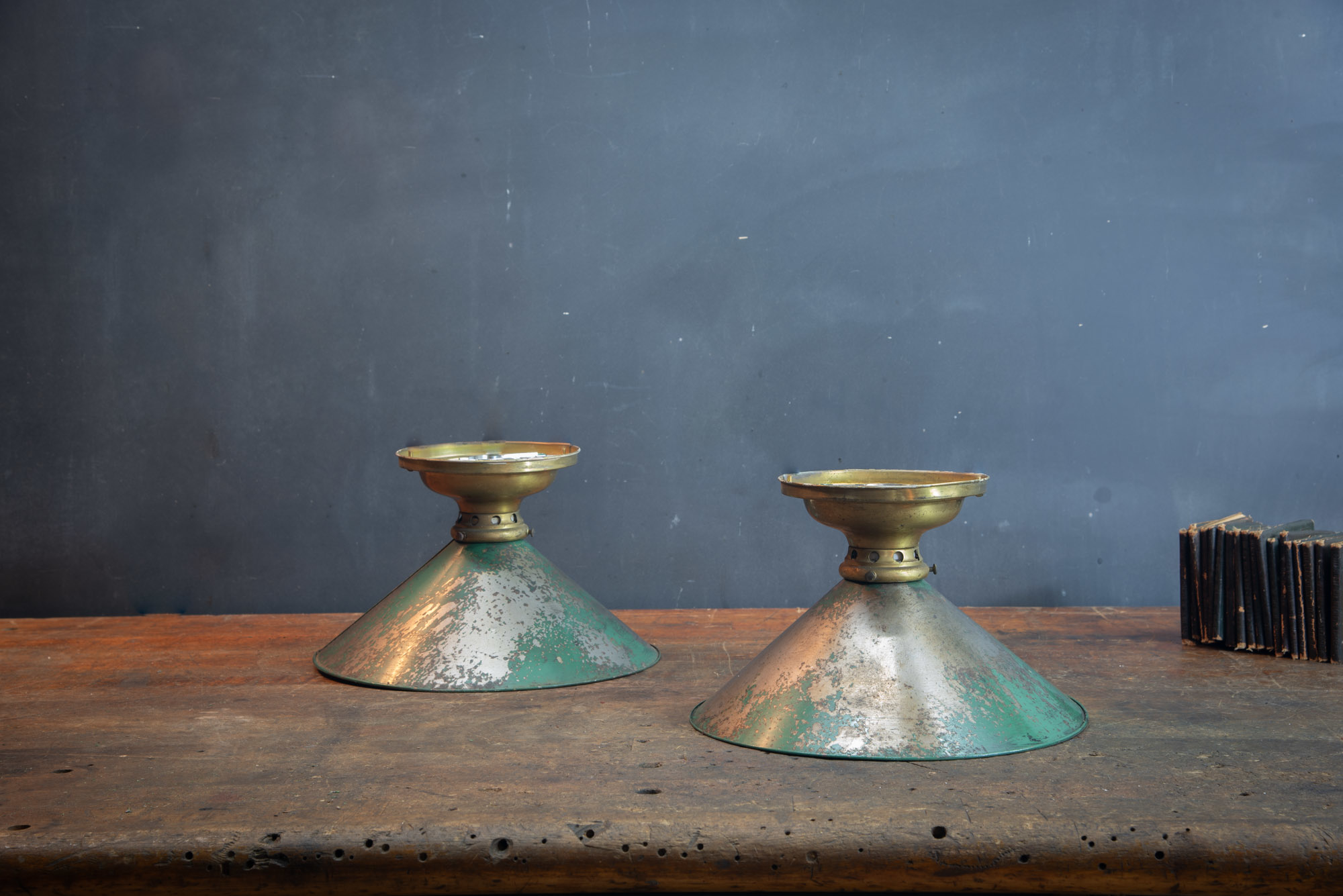 USA, 1930s, Vintage Industrial Flush Mount Ceiling Lights. Heavily patina'd tin industrial cone reflectors with early brass ceiling mount holders. Fully rewired. 2 available.