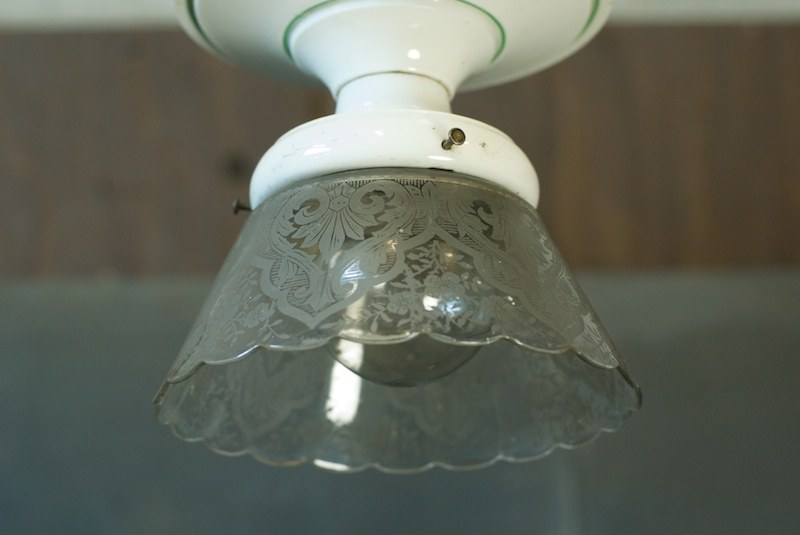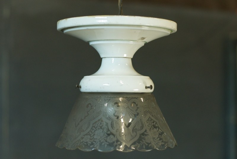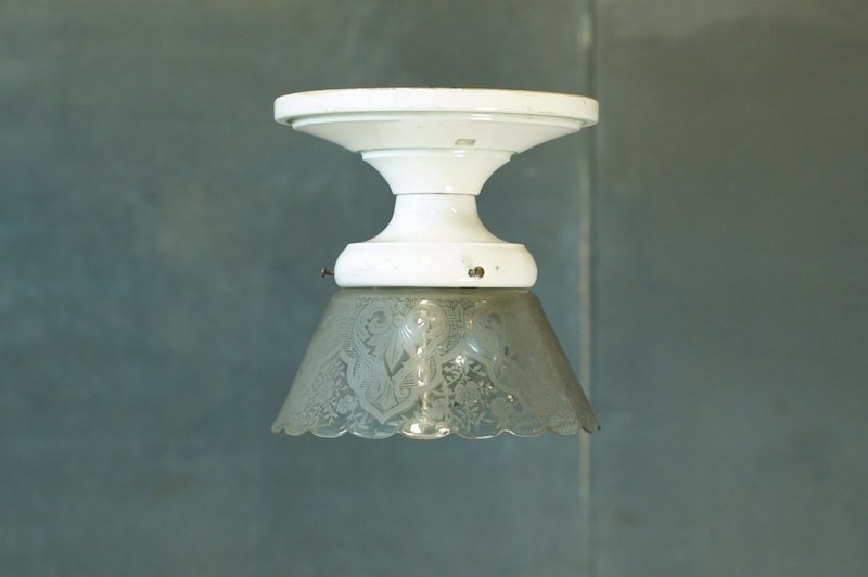 Vintage Early Century Porcelain Ceiling Mount Lumiere with Acid Etched Clear and Translucent Shade.