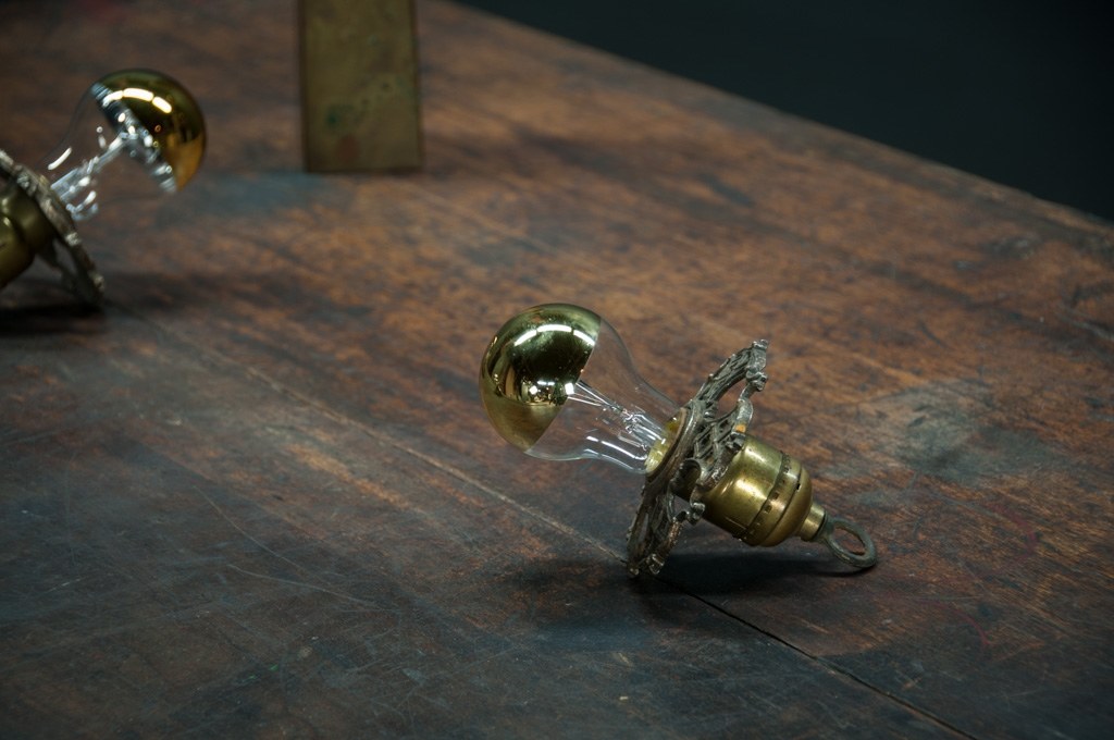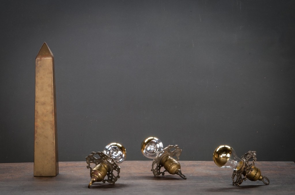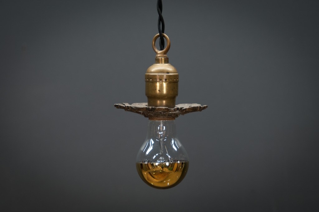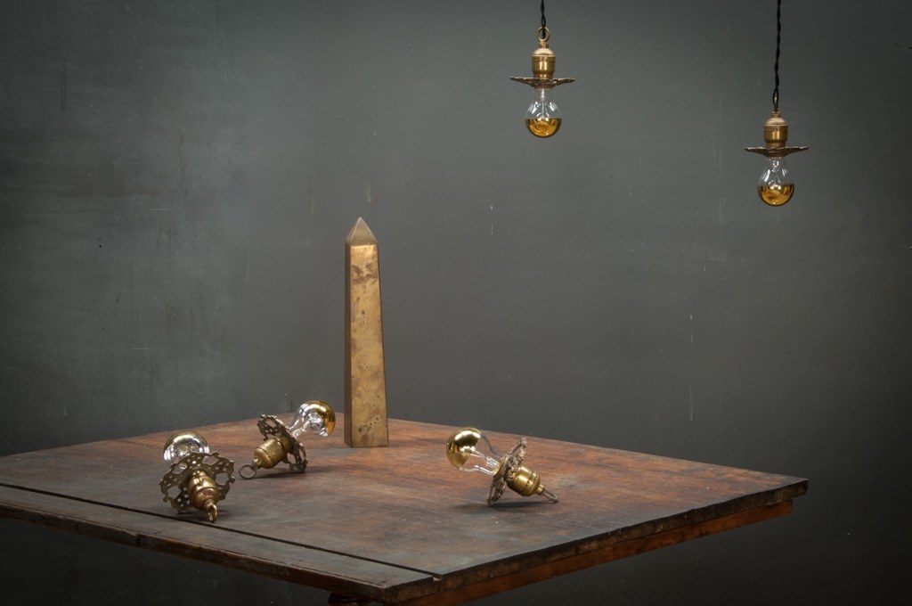 USA, 1930s, Vintage Petite Baroque Ceiling Pendant Lights. Intricate Brass Detailings. Fully Rewired Brass Turnkey Sockets. Unique Half Brass Bulbs Included. 2 Available.