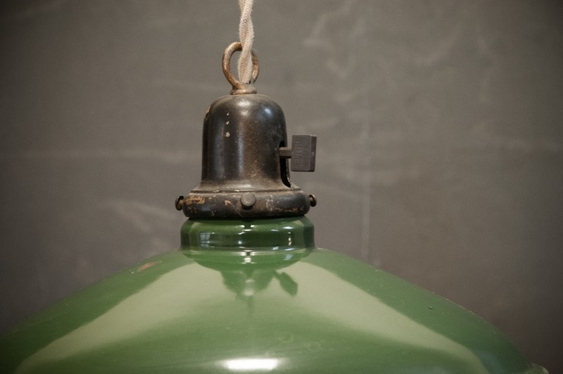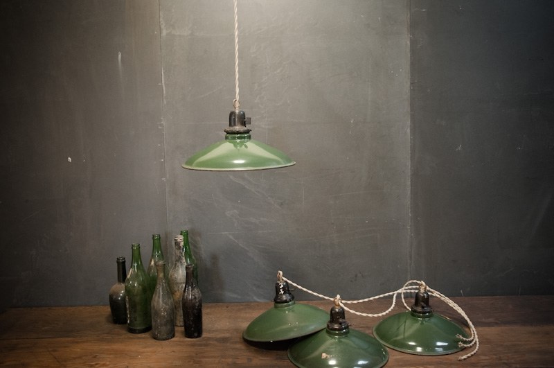 USA, 1930s, Vintage Westinghouse Bankhouse Hanging Pendants. Green Porcelain Finish with White Porcelain Interior Reflector. Remnants of the Old Paper Westinghouse Labels present on the Exterior of the Shades. Fully Rewired with 3' of Braided Cloth Cord and Turnkey sockets. 4 Available.