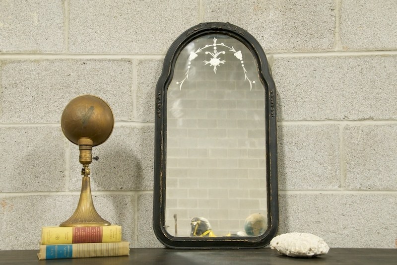 France, c.1920s. Late Victorian Etched Glass Water Closet Portrait Mirror. Floral Carvings throughout Wooden Frame.