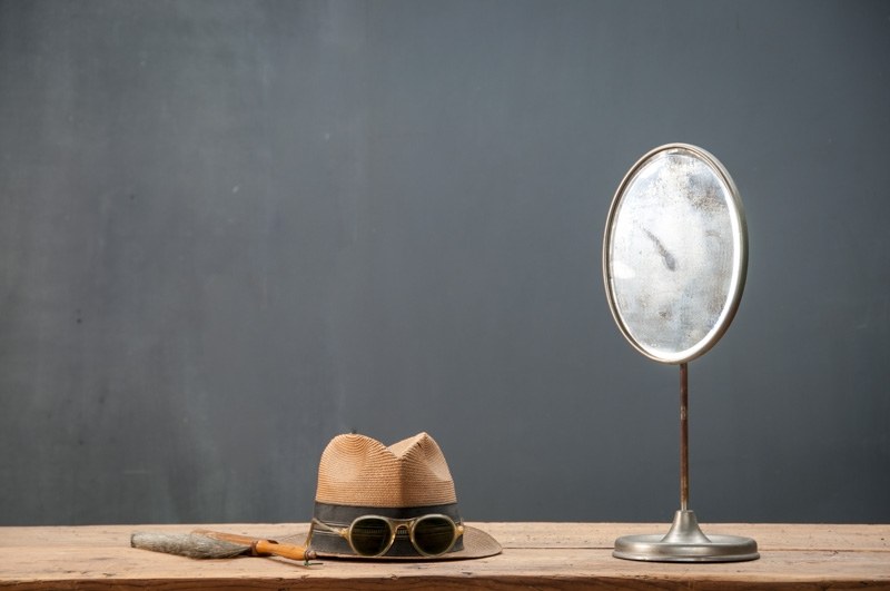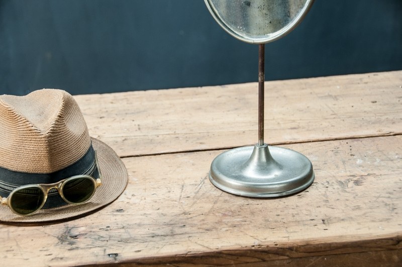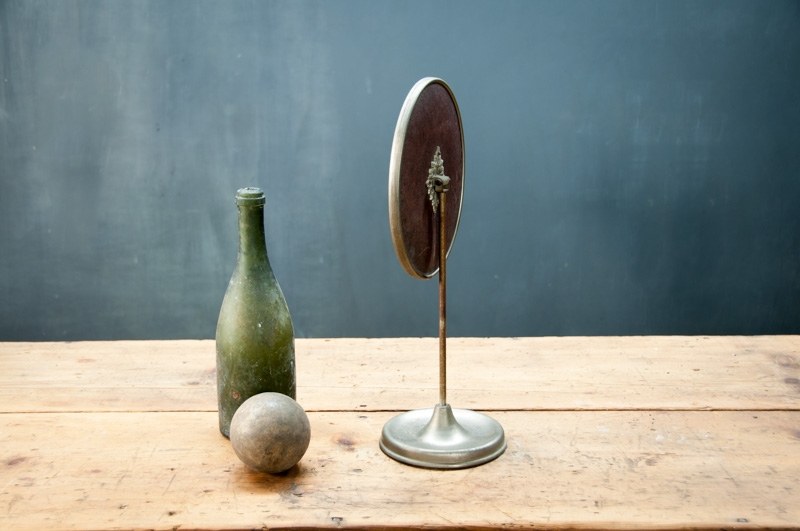USA, 1920s, Vintage Hat Shop Counter Mirror. Nickel Plated Pivoting Stand with Time Worn Mercury Glass Mirror.