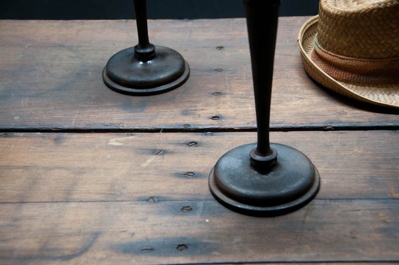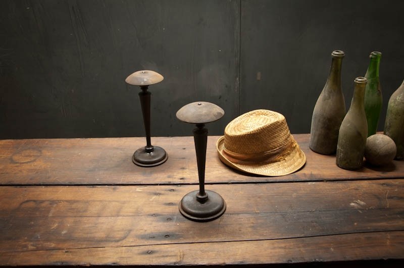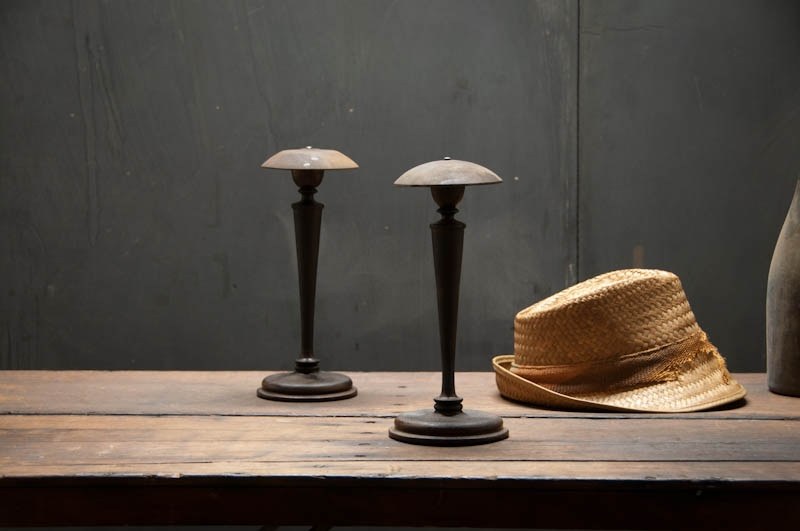 France, 1895, Vintage French Regency Shopkeepers Hat Displays. Turned Wood with Domed Metal Tops. Unique Early Design. Time Worn Patina.