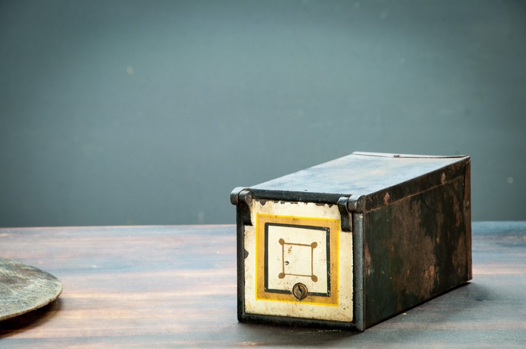 USA, 1920s, Vintage Pursers Maritime Cast Iron Safety Box. Cast Iron and Steel Construction. Graphical Hand Painted Front. Time Worn Patina. No Key.