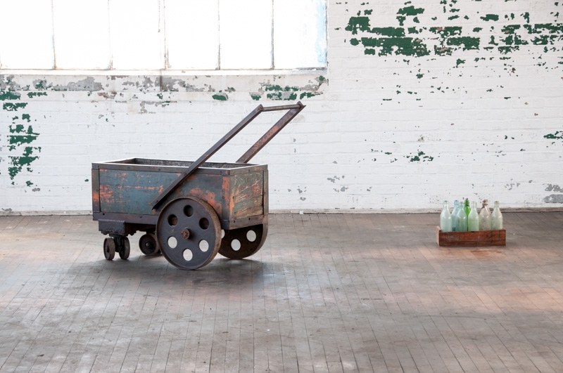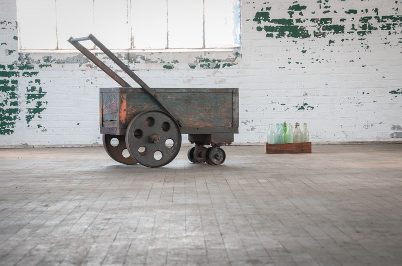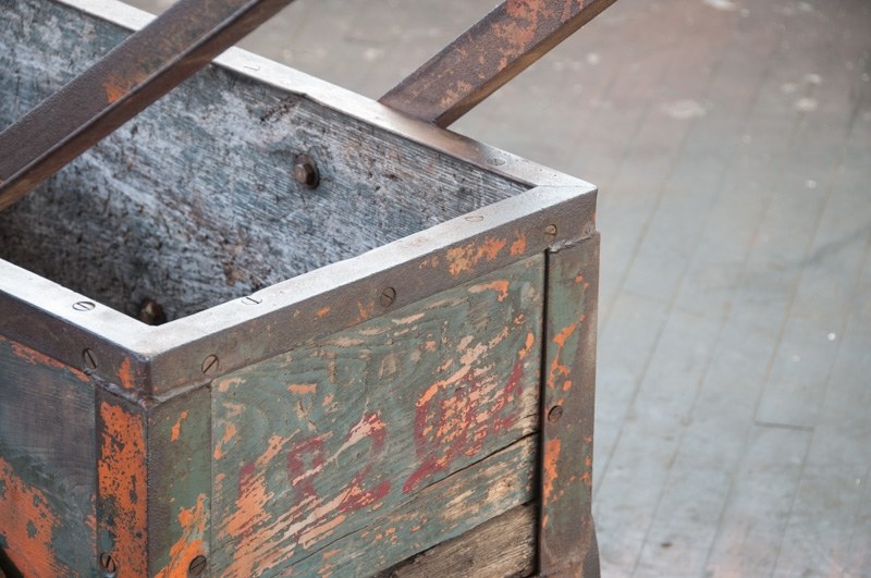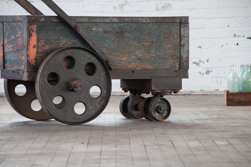 USA, 1920s, Vintage Industrial Mining Cart. Steel, Cast Iron, and Hardwood Construction. Time Worn Blue and Orange Paint. Unique. Smooth Rolling.