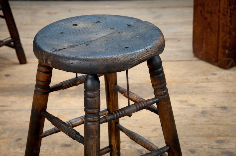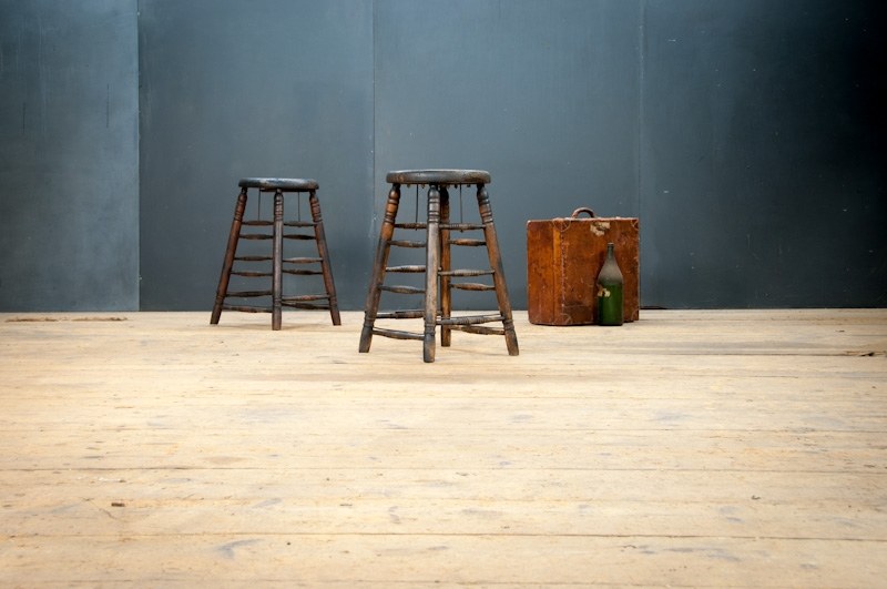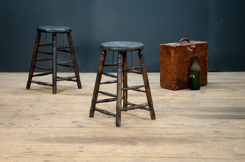 USA, 1910s, Early Century Clerks Spindle Stools. Hardwood Oak Construction with Unique Steel Rod Bracing. Beautiful Time Worn Patina. Solid and Stable.