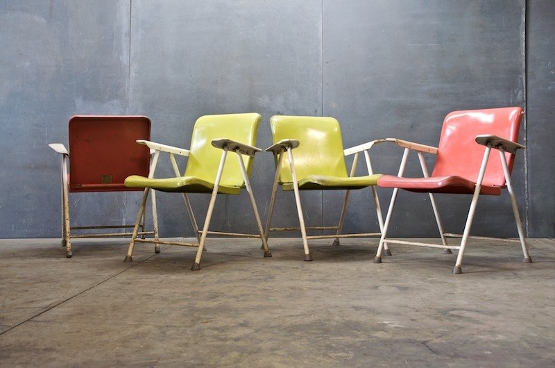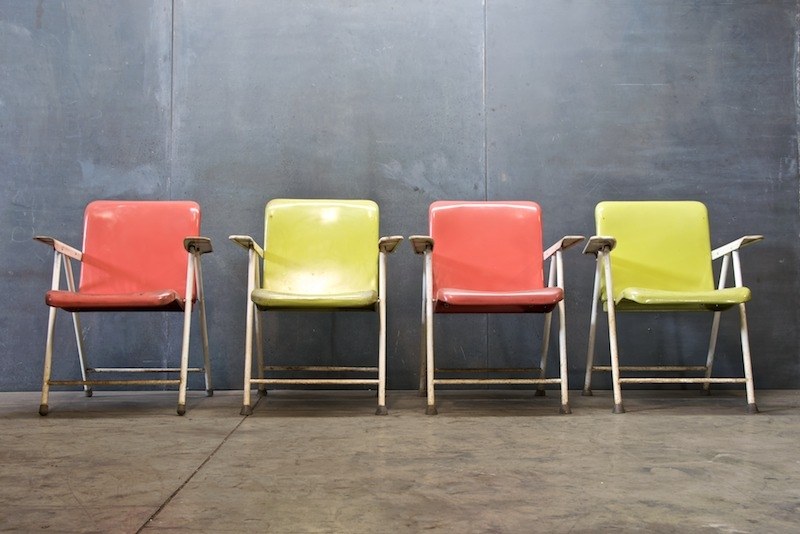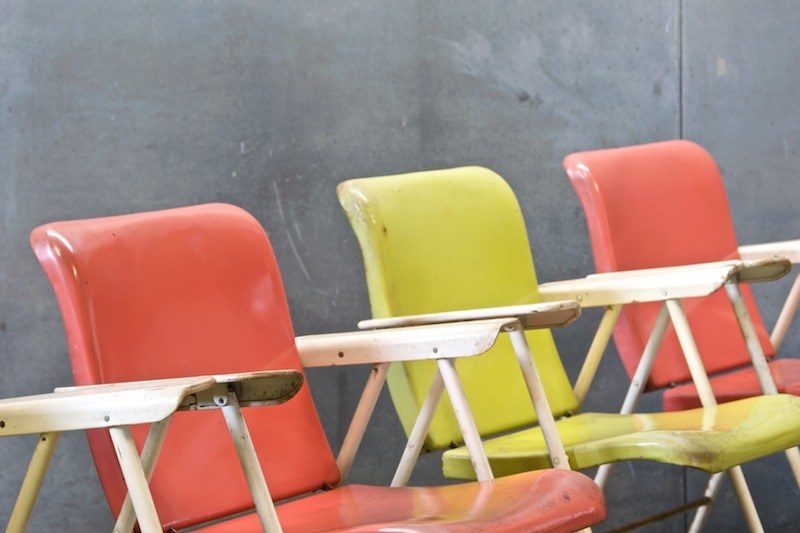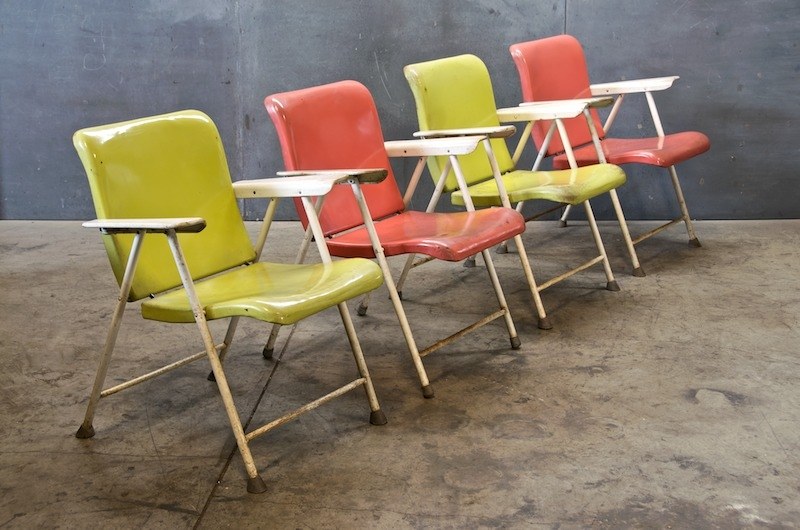 USA, c.1950s. Russel Wright Easter Palette Orange Peach and Yellow Steel Panel Folding Porch Chairs. Excellent Original Condition and Paint. Heavy Gauge Steel Surfaces. Functioning Properly.