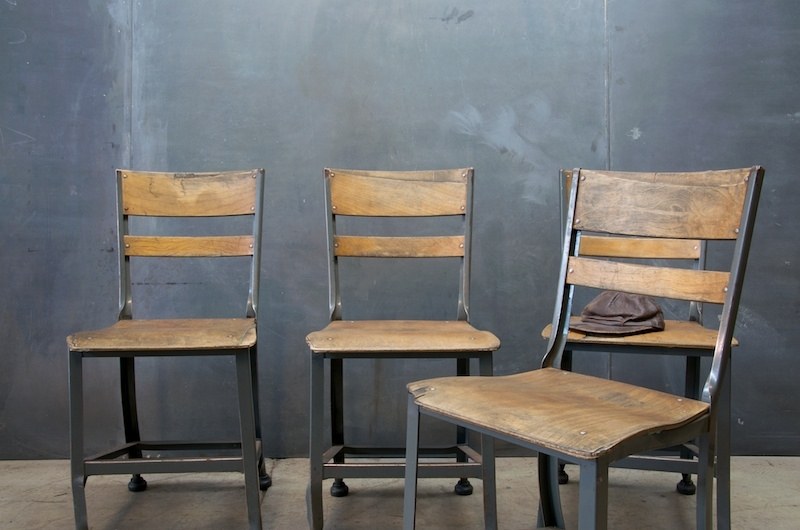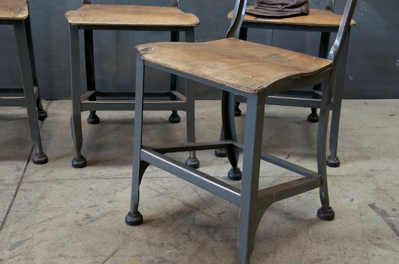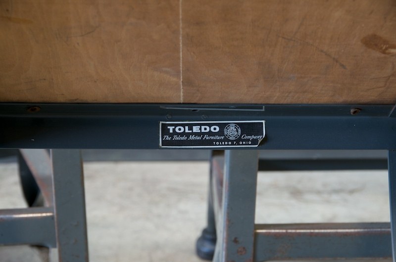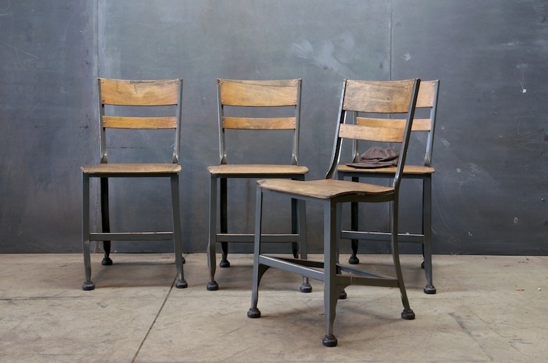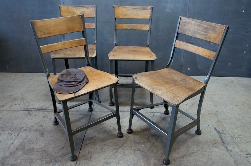 A Set of Four Toldeo Metal and Maple Chairs. Very worn, and heavy patina. Structure is very sound. Nice classic vintage industrial.