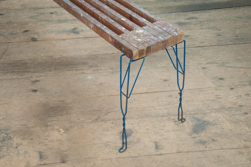 USA, 1950s, Vintage Artist Painter's Palette Bench. Extendable Plank with Twisted Wire Eiffel Legs. Solid and Stable. Rich, Time Worn Patina.