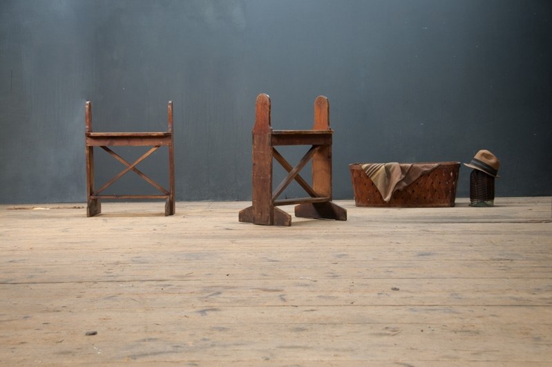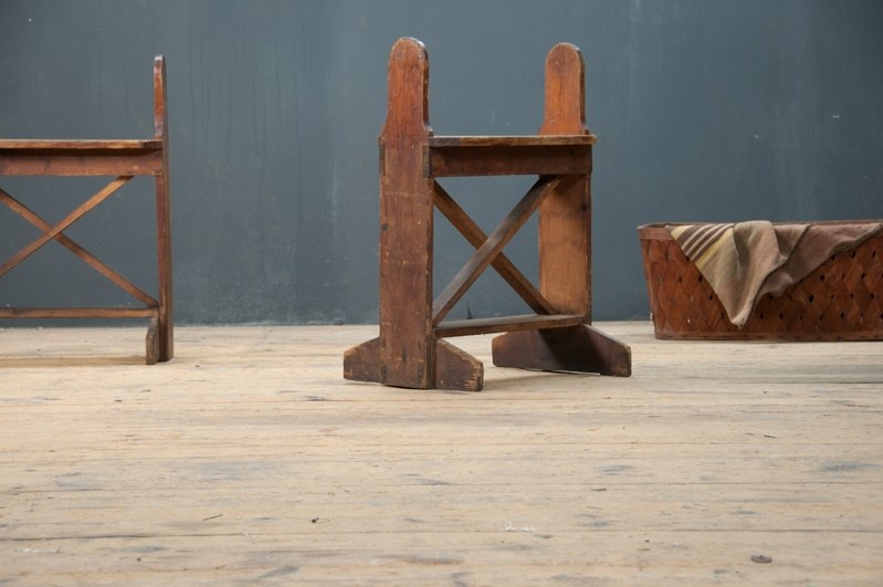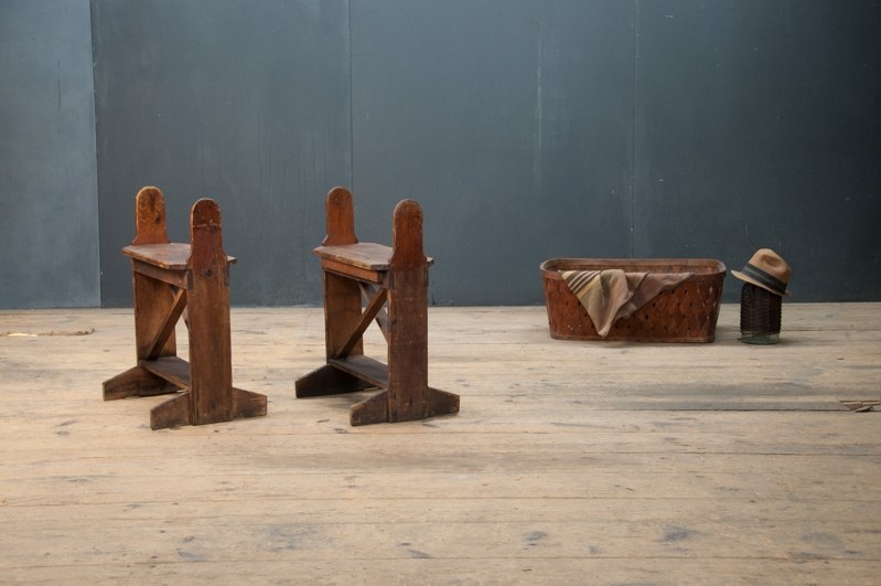 USA, 1940s, Vintage Lauxmont Equestrian Cross Brace Stools. Old Growth Pine Construction. Solid and Stable. Time Worn Patina.