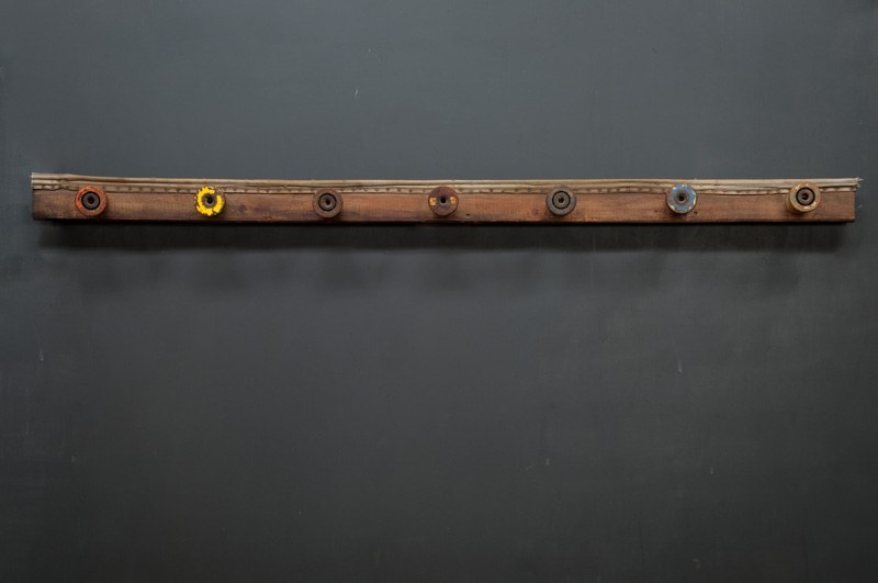USA, 1940s, Vintage Primitive Twill Mercantile Clothiers Wall Rack. Hardwood Construction with Old Ticking Fabric Trim. Rich, Time Worn Patina. 3 Available.