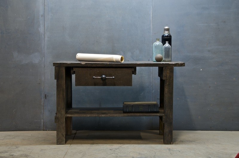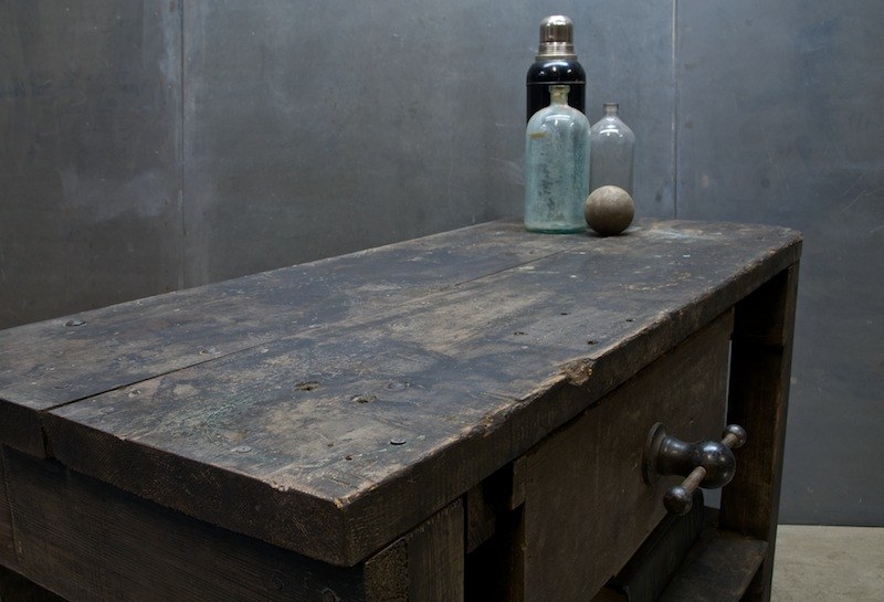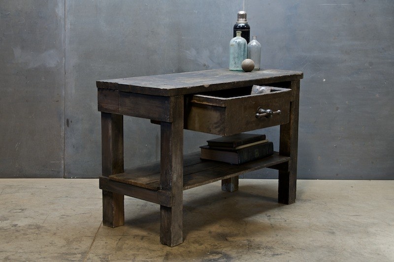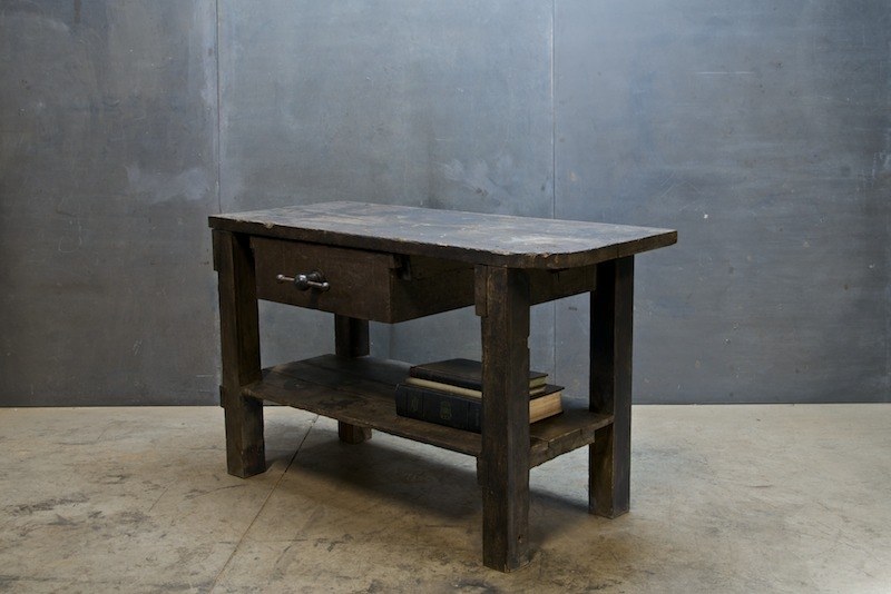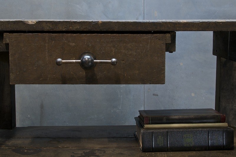 England, c.1930s. Vintage Old Century Canal Pier House Workbench Table. Mill Cut Old Growth Seaside Pine. Primitive Single Drawer, Black Iron Detailings. Solid, stable and heavy.