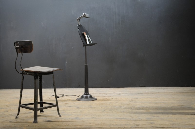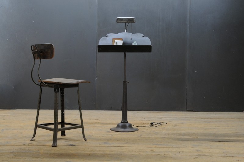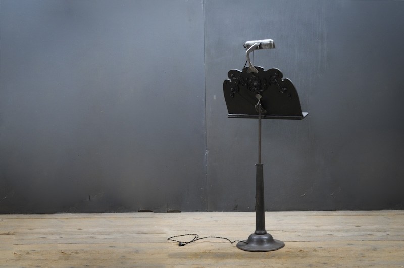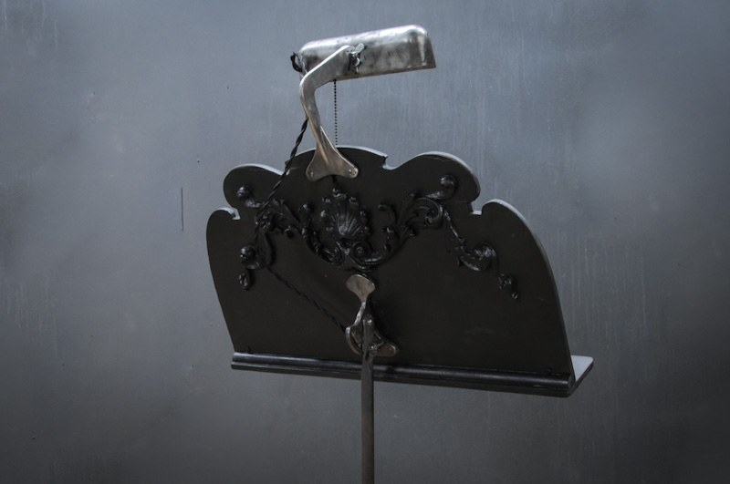 USA, 1930s, Vintage Odd Fellows Lodge Lectern Podium Stand. Cast Iron and Wood Construction. Fully Adjustable Tilt and Height. Unique Hand Carved Scroll Work on the Back. Cast Aluminum Adjustable Pull Chain Light. Solid and Stable.
