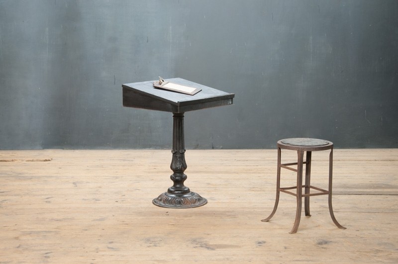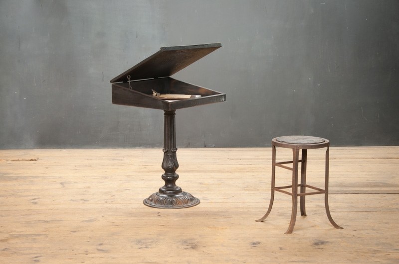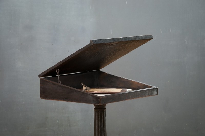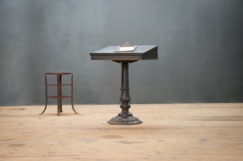 USA, 1940s, Vintage Industrial Bridge Street Lectern Stage Stand. Old Growth Pine Flip Top Platform Desk with Cast Iron Base. Heavy Weighted. Solid and Stable. Time Worn Patina.