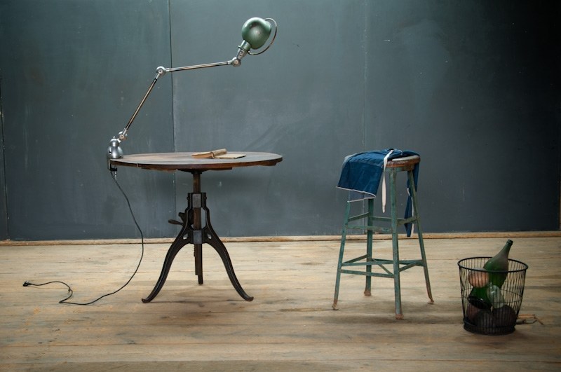 NYC, 1898, Vintage Turn-of-the-Century Meyrowitz Opticians Industrial Crank Table. Heavy Swag Leg Cast Iron Base with Old Growth Pine Wood Top. Fully Adjustable Height for Use as a Coffee Table, Dining Table, or Bar Table. Time Worn Patina.